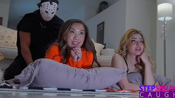 Two playful chicks get tight pussies fucked by a stepbro on Halloween
